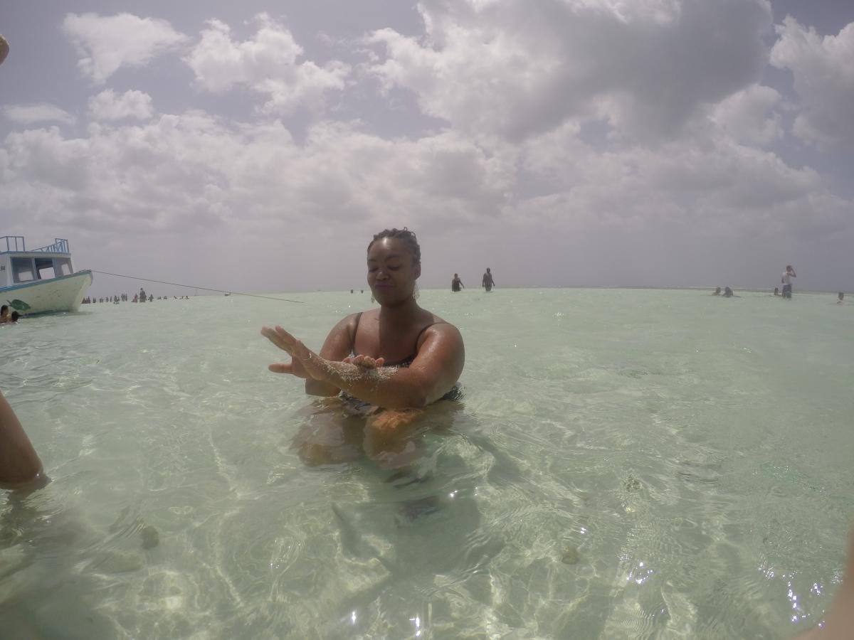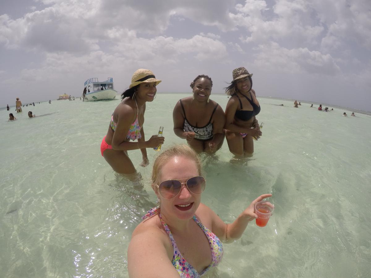 After snorkeling, the next destination was Nylon Pool. This is a shallow “pool” in the middle of the ocean. It is said if you swim in the pool, it will restore you to ten years younger. Also, the sand is an exfoliater, which I believe because it was rough and shelly, unlike smooth sand you would imagine being there. At this point, everyone was off the boat bringing fresh life into their souls, but drinking away their livers. There was music playing from the boat, and it reminded me of a MTV Spring Break show, but in the good type of way. There were singles, couples, and families all having a fabulous time.